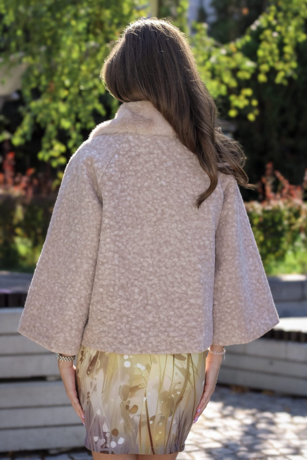 Късо палто в бежов меланж с широки ръкави и пухена яка арт.1600