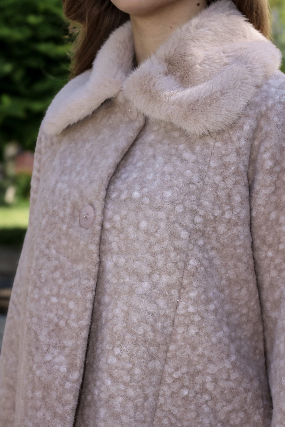Цвят: Светъл беж с лек меланжов ефект Стил: Елегантно и универсално – подходящо за есенно-зимния сезон и стилни градски визии Силует: Свободен и леко разкроен – за комфорт и модерно излъчване Яка: Обемна пухена яка в кремав нюанс – придаваща топлина и мекота Дължина: Къса – завършва над ханша, лесно съчетаема с поли и панталони Детайли: Декоративно релефна текстура, едноредно закопчаване с едри копчета отпред, широки ръкави с прав завършек Материя: Топла и пухкава – осигурява уют през по-хладните дни Състав: 100% полиестер