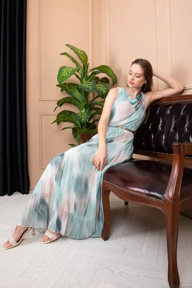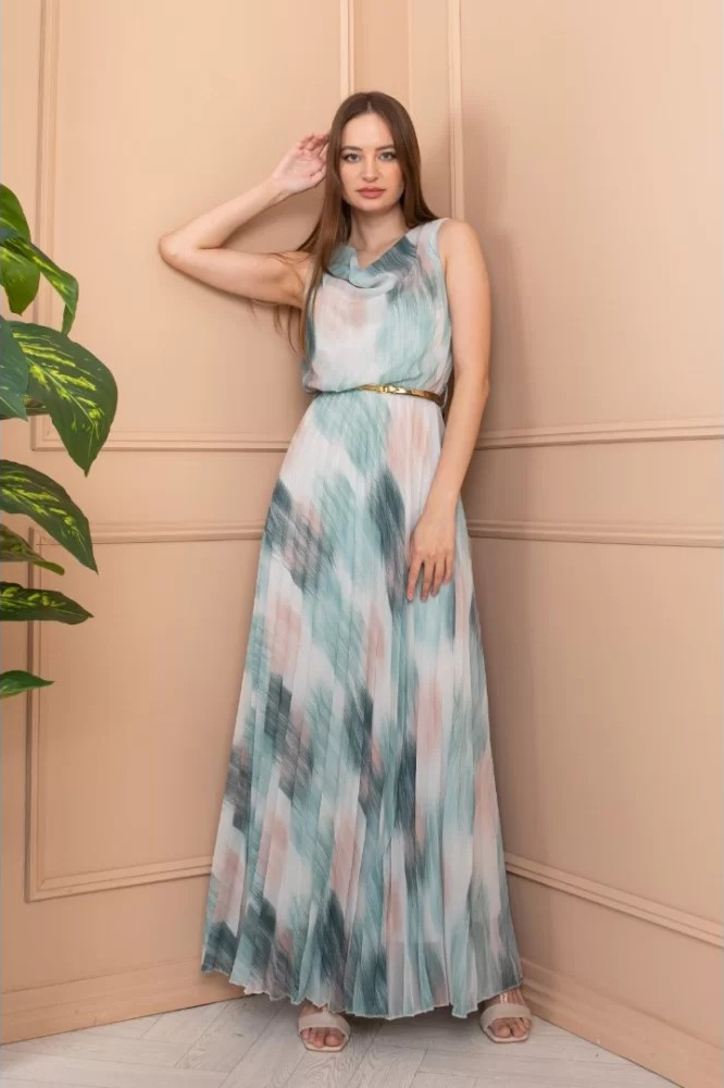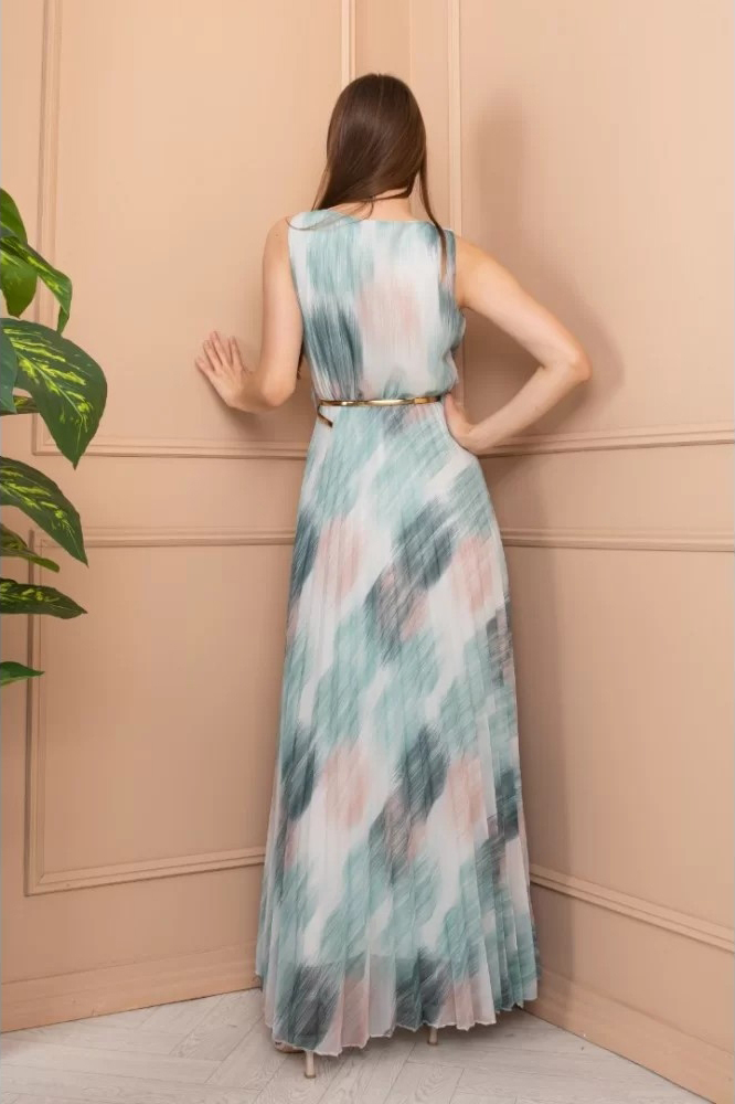 Дълга плисирана рокля с акварелен принт мента и колан арт.1449