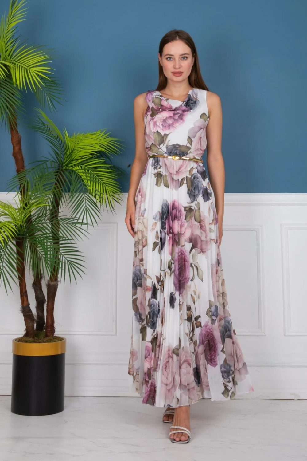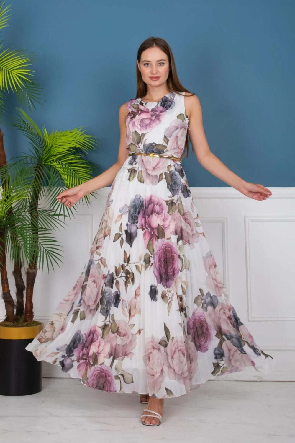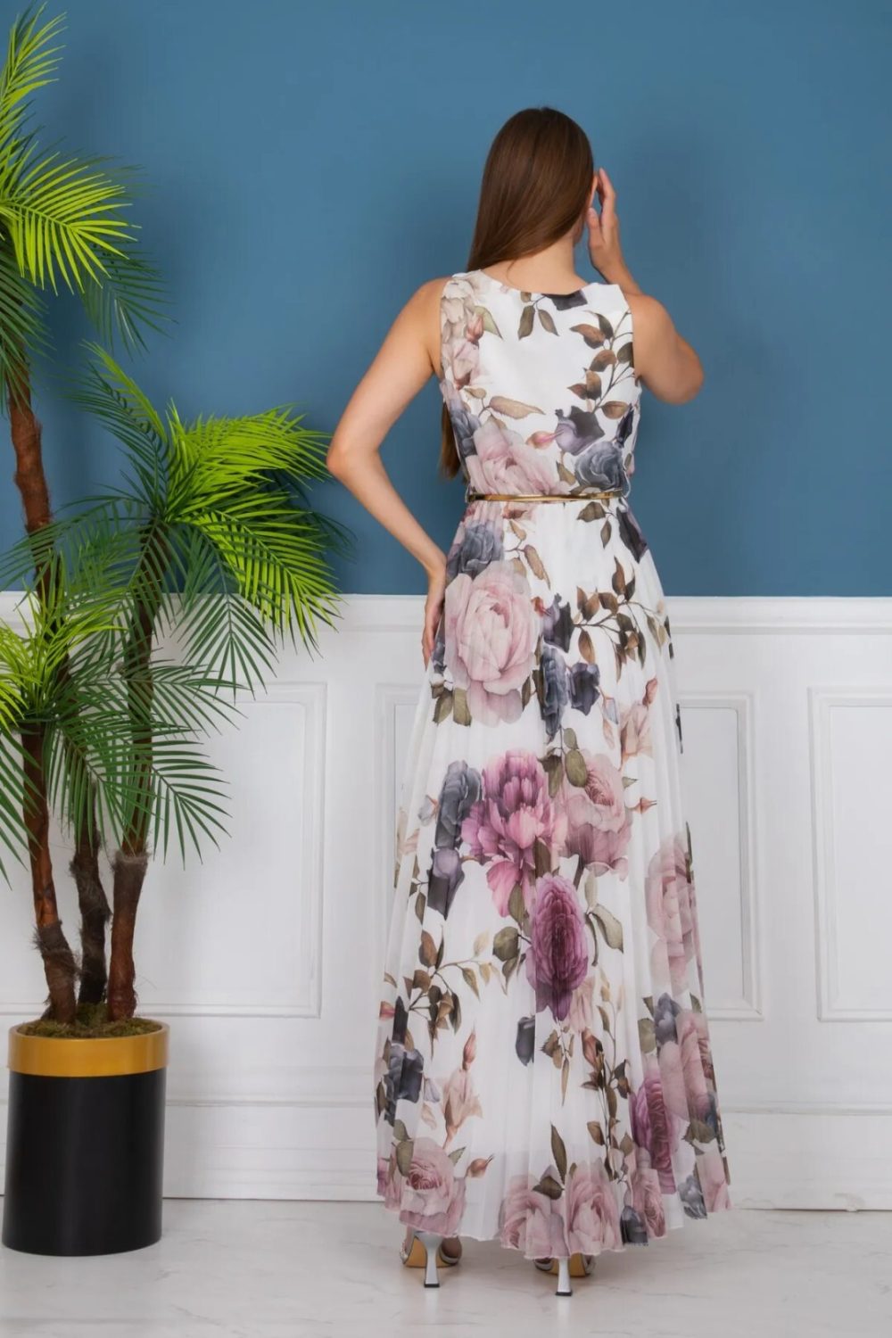 Дълга плисирана рокля с флорален акварелен принт и колан арт.1453