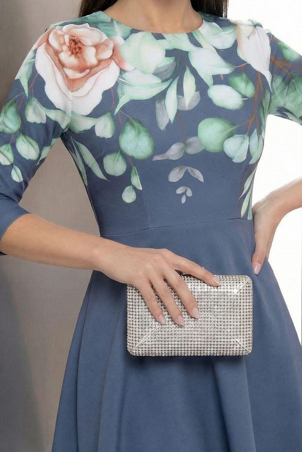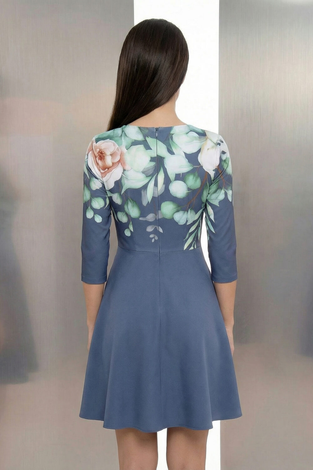 Цвят: Флорални мотиви и наситени цветове – свежо, женствено и стилно съчетание Стил: Романтичен и артистичен – подходящ за дневни събития, коктейли и стилни поводи Силует: Прилепнал в горната част, разкроен в долната – подчертава талията и създава балансирана визия Дължина: До коляното Ръкави: 3/4, полупрозрачни – с флорална бродерия, добавяща деликатност Детайли: Големи рози и зелени листа в горната част, едноцветна синя пола, кръгло деколте Материя: Сведно еластична основа Състав: 95% полиестер, 5% еластан