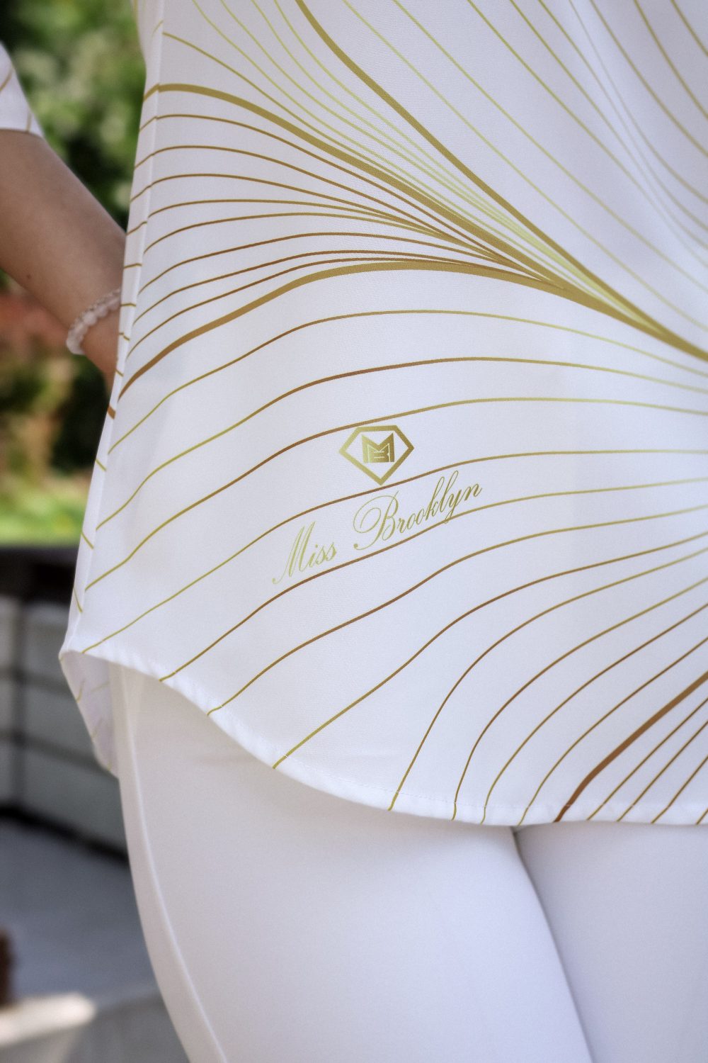 Цвят: Свежа бяла основа с луксозен златист принт.