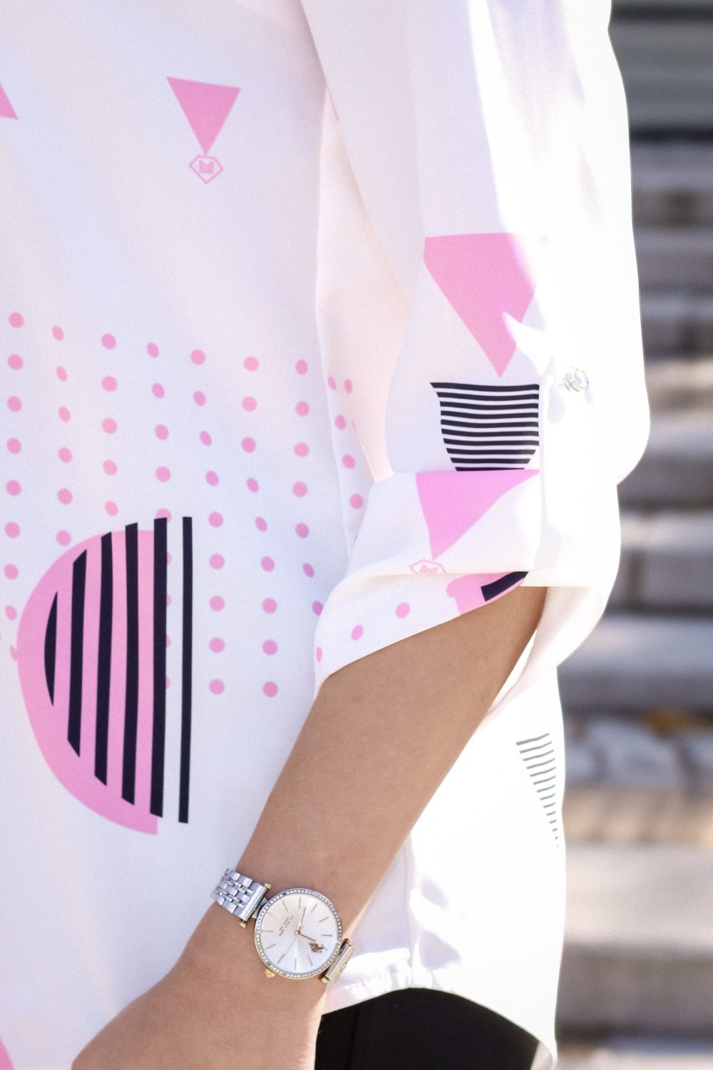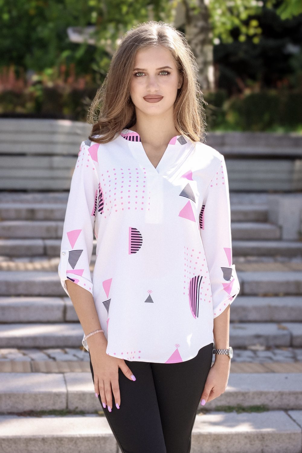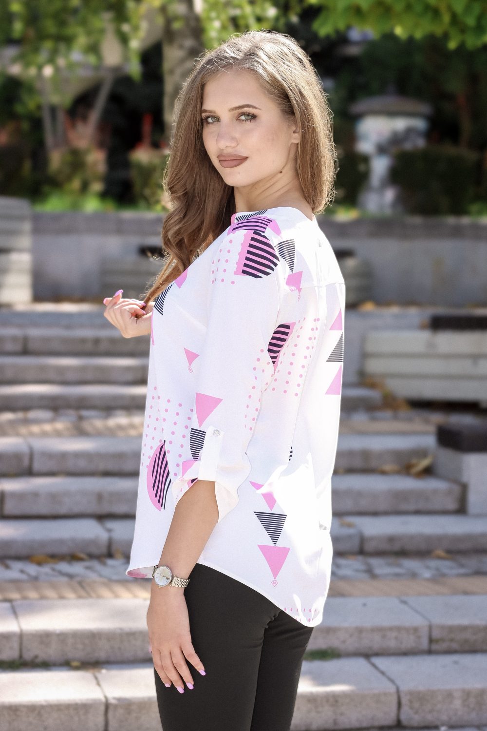 Цвят: Свежа бяла основа, контрастираща с ярко розов (неон) геометричен принт.