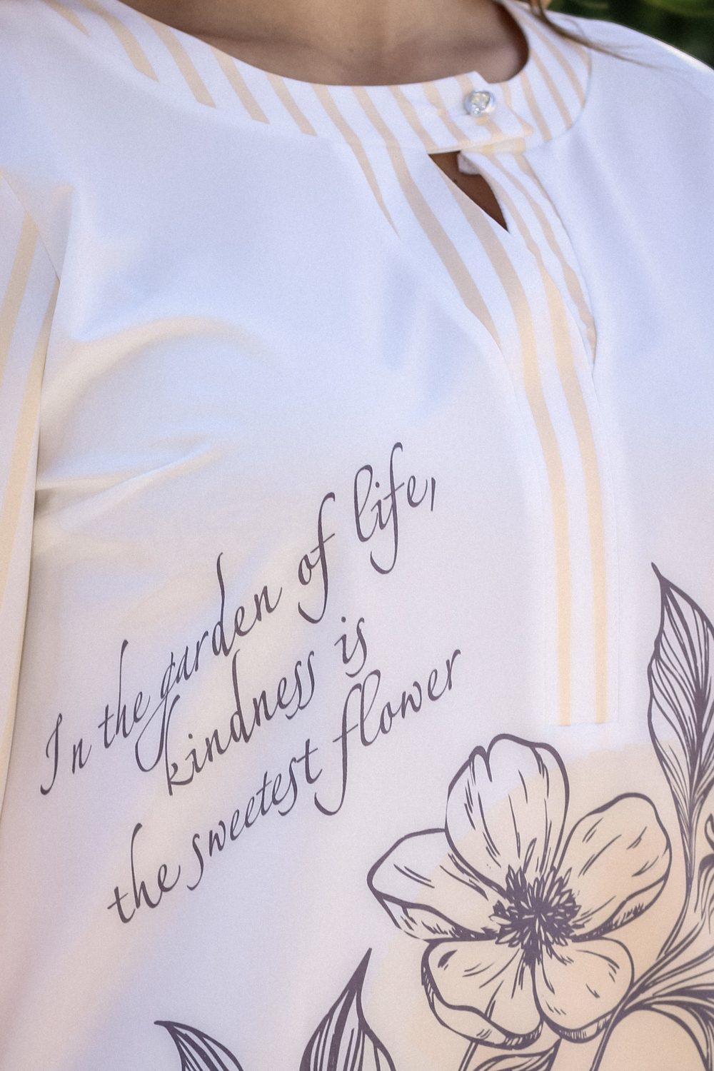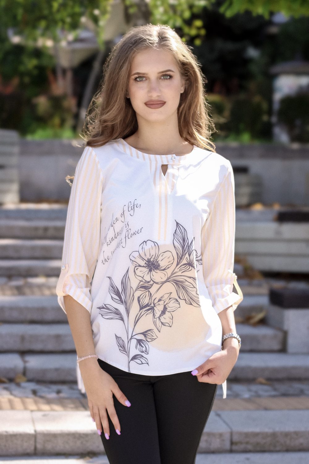 Елегантна бяла блуза “Kindness” с флорален принт и райе арт.1465