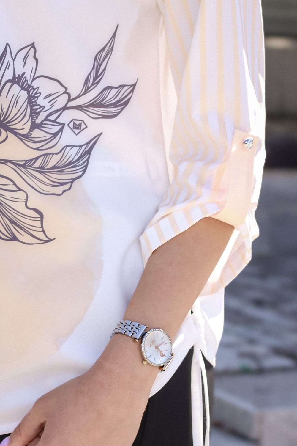 Тази свежа и модерна блуза комбинира класически елементи като райе с нежен флорален принт, създавайки уникална и романтична визия. Свободният ѝ силует и регулируемите странични връзки осигуряват перфектен комфорт и възможност за оформяне на желаната дължина. Бялата блуза се съчетава прекрасно с панталони или дънки и е идеална за внасяне на пролетно настроение във всяка визия.