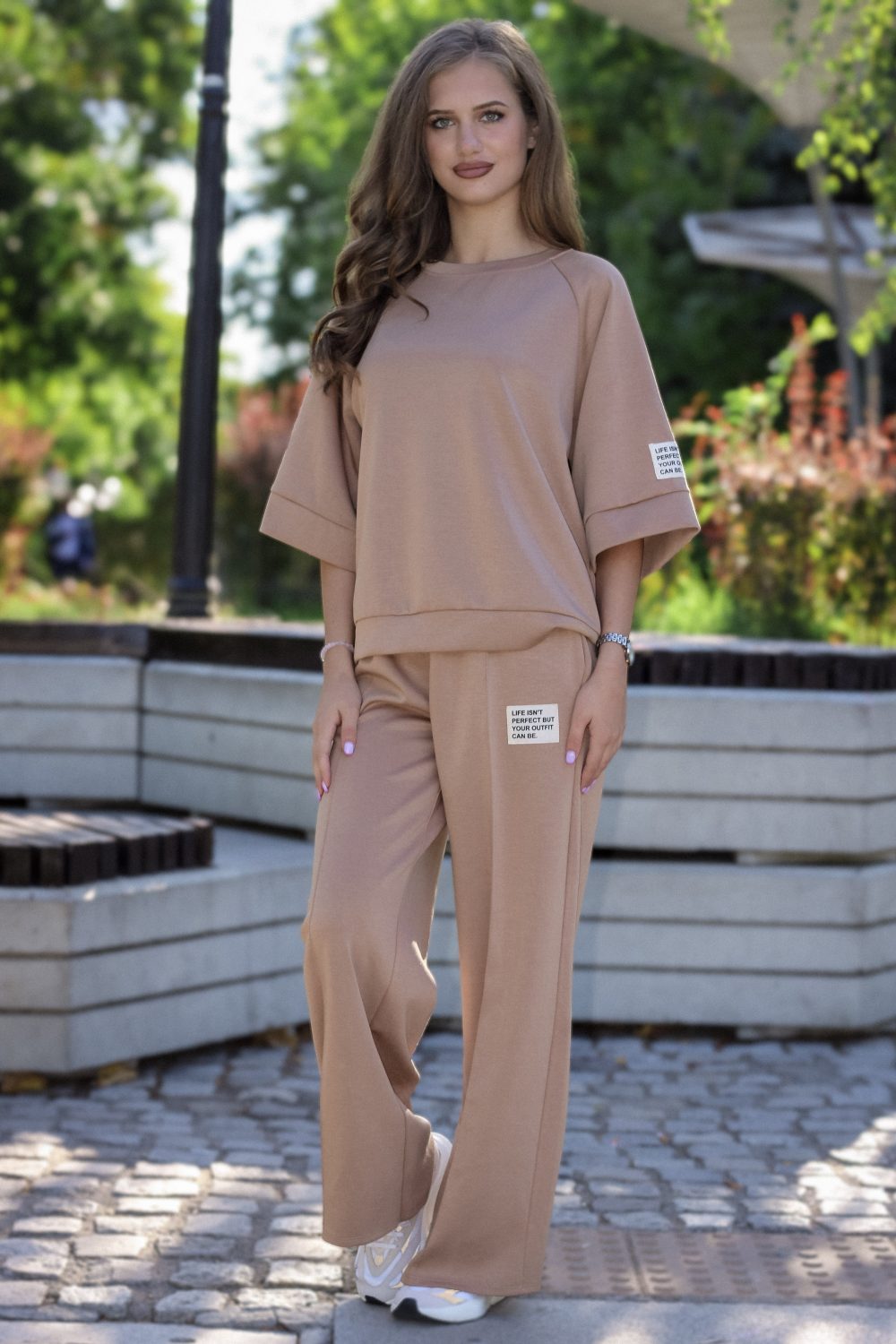 Горна част: Свободна блуза/суичър с обло деколте и широк 3/4 ръкав с обърнат подгъв. Декоративен текстилен етикет на ръкава с посланието: “Life isn’t perfect but your outfit can be.”
