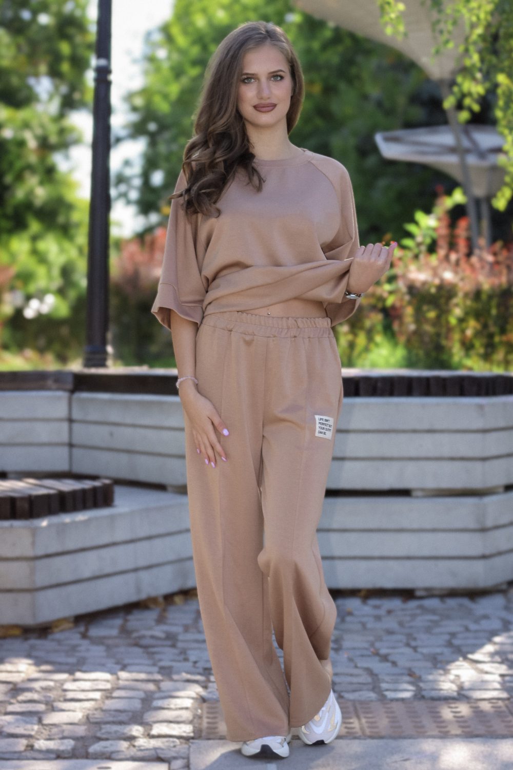 Долна част: Панталон тип “палацо” с изключително широки и прави крачоли. Висока талия с еластичен колан (ластик) за максимален комфорт. Функционални джобове отстрани. Декоративен текстилен етикет на леглото.