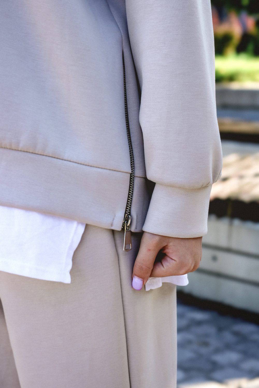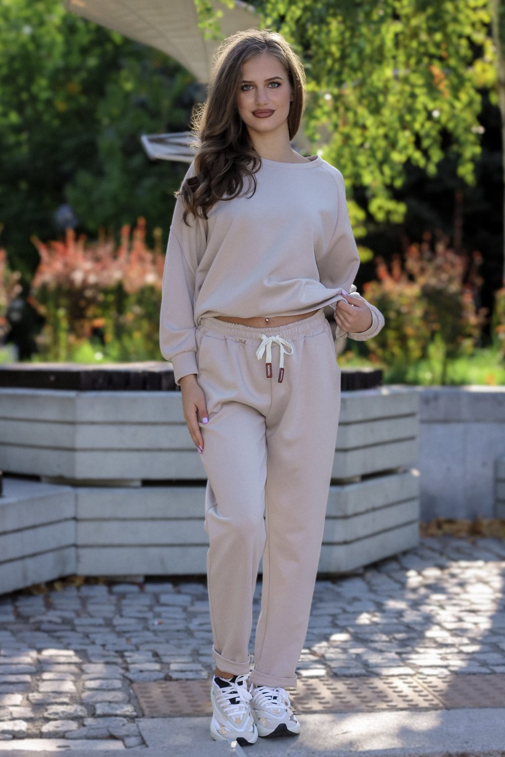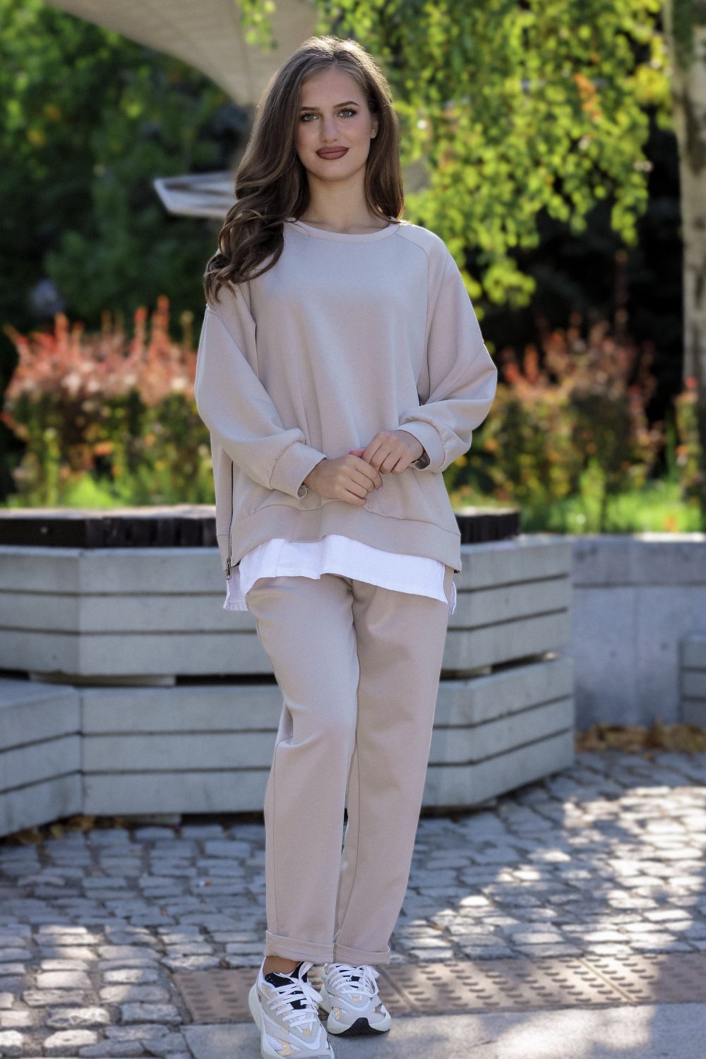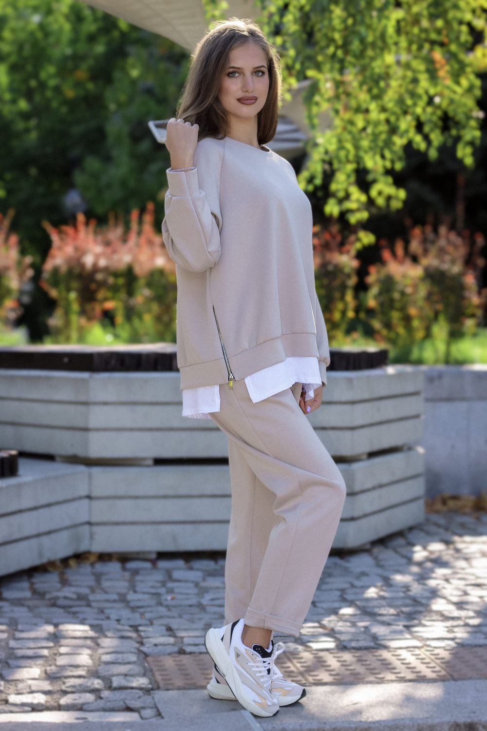 Този модерен спортен комплект в неутрален цвят капучино е създаден за комфорт и стил. Страничните ципове на суичъра са актуален акцент и позволяват носенето на блуза или тениска отдолу за модерна слоеста визия. Удобният панталон с ластик и връзки е идеален за активен ден, като същевременно поддържа стилна и актуална линия.