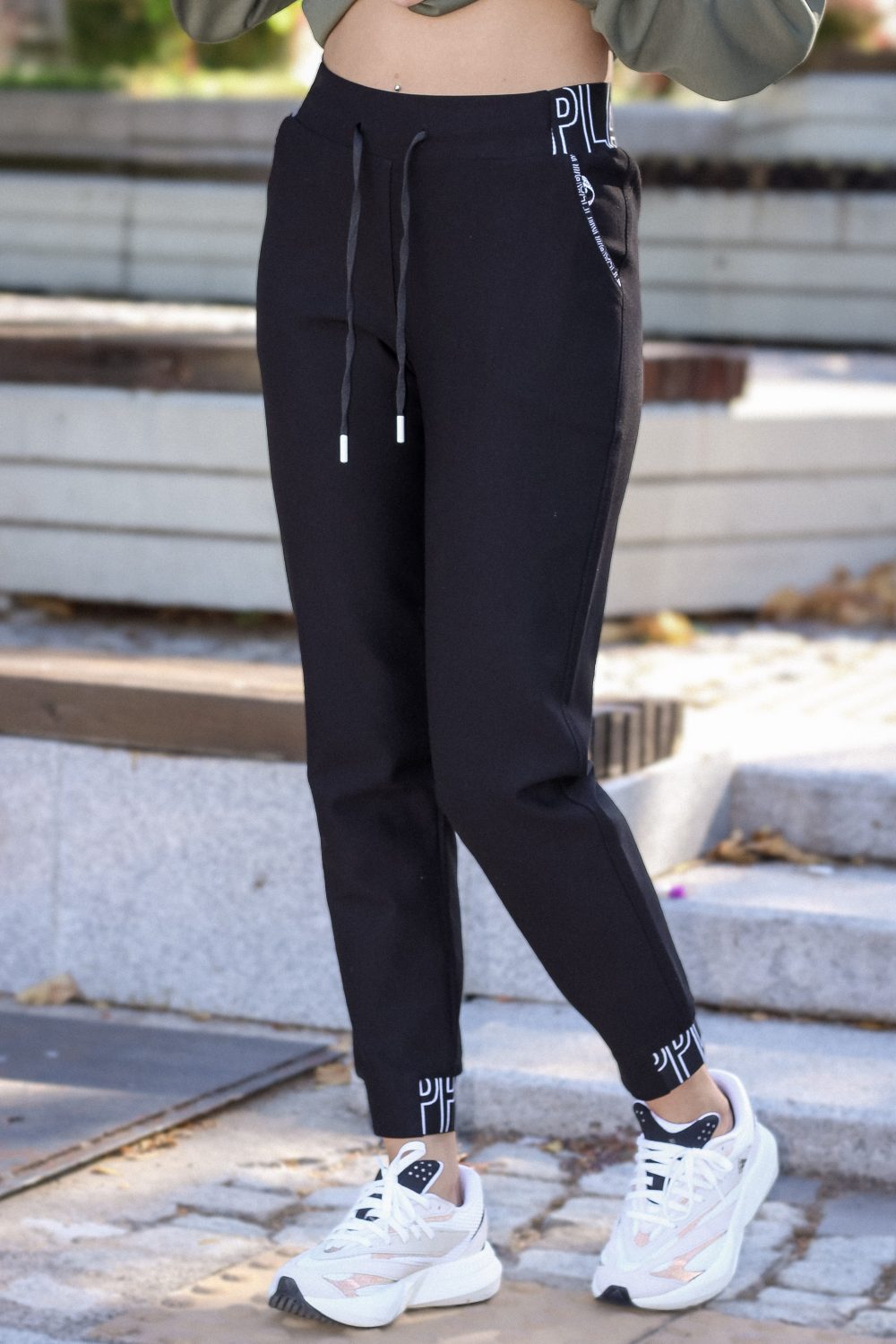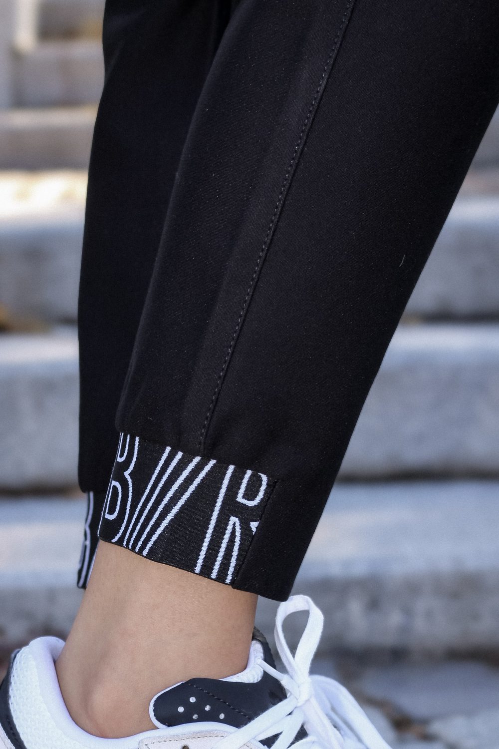 Ластични маншети в долната част на крачола със същия контрастен надпис, който придава модерен завършек и фиксира панталон.