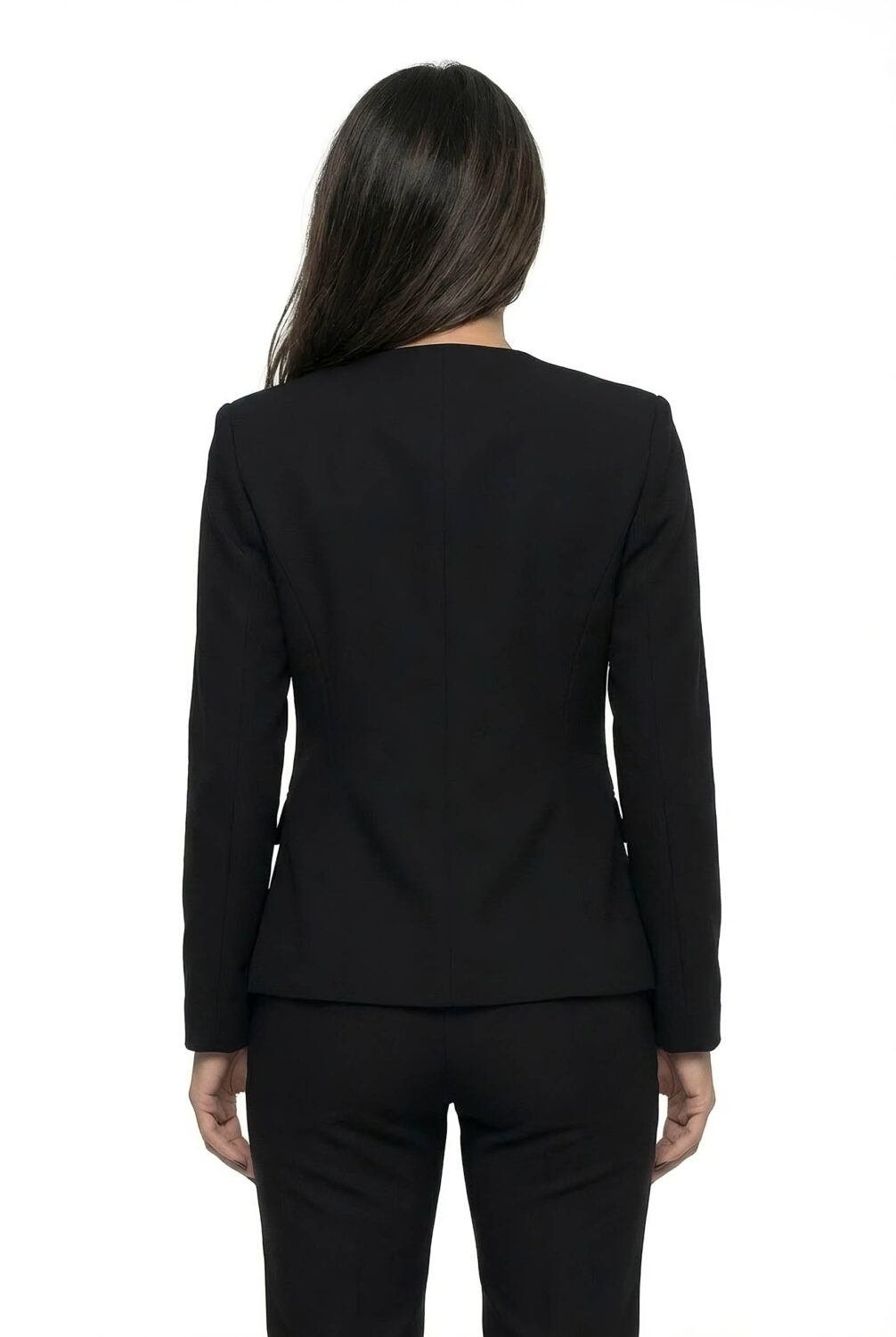 Черно дамско сако с метални копчета – елегантен модел с прилепнал силует и изчистен дизайн. Идеално за офис, бизнес срещи и стилни ежедневни визии. Без яка, с модерна линия и комфортна материя. Сако за жени, които ценят стил и увереност.