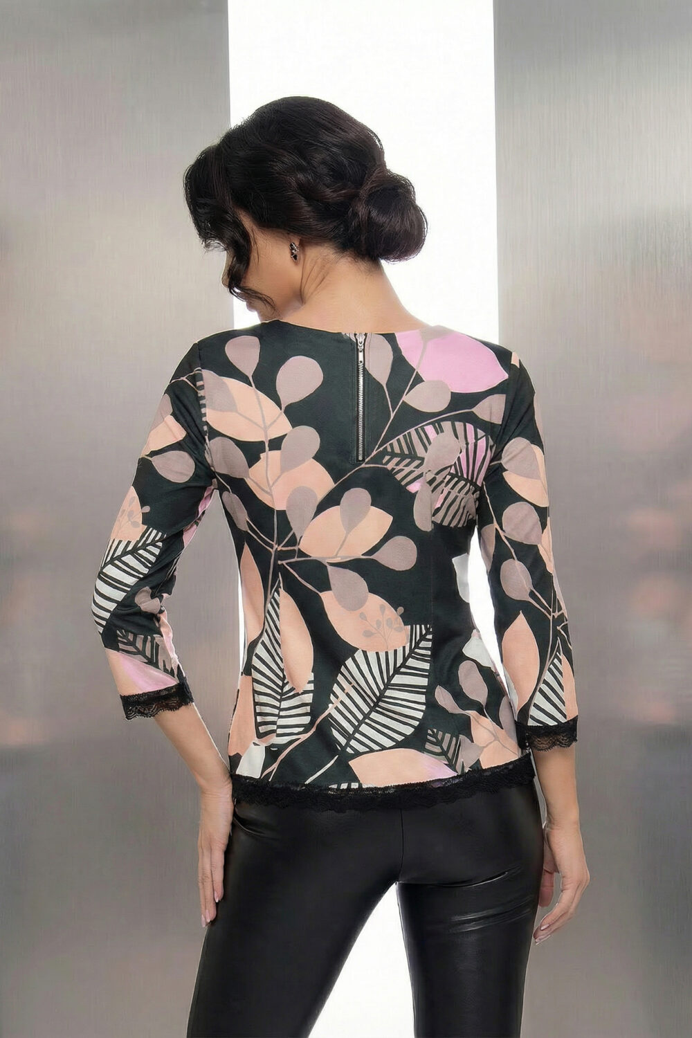 Цвят: Многоцветен – абстрактни листа и флорални мотиви в розово, прасковено, бежово, черно и бяло Стил: Артистичен и модерен – подходящ за ежедневие, офис или стилни поводи Силует: Прилепнал, с подчертана линия и комфортно прилягане Деколте: Кръгло Ръкави: 3/4 дължина с дантелен кант Детайли: Ефектен ботанически принт с абстрактни форми, черна дантела по ръкавите и долния кант, които придават изтънченост Материя: Гладка и еластична, с лека текстура и меко усещане Състав: 95% полиестер, 5% еластан