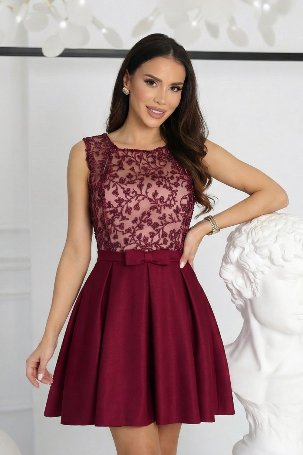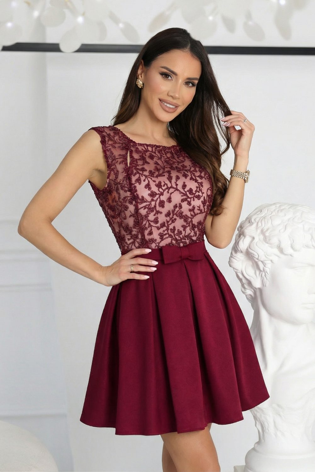 Бордо рокля с флорална дантела и разкроена пола – стилен модел за празнични поводи и коктейли. Прилепнал силует в горната част, декоративна панделка и текстура, която създава усещане за лукс и романтика. Рокля за жени, които искат да впечатлят с цвят, елегантност и изящество.