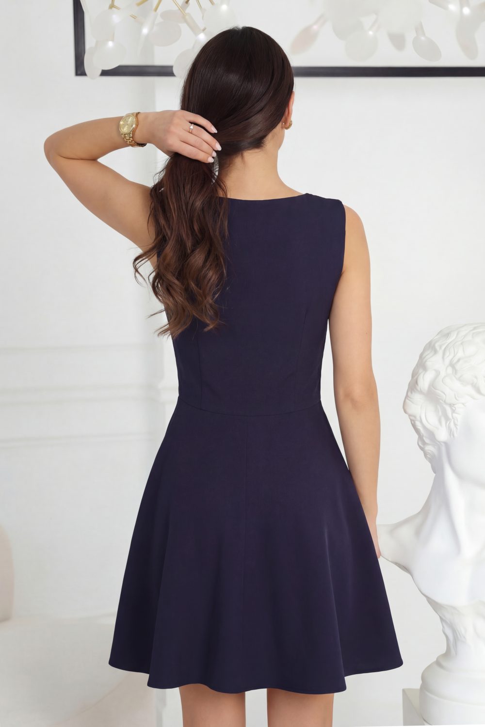 Цвят: Тъмносин – дълбок, елегантен и класически Стил: Официален и коктейлен – подходяща за празници, събития и специални поводи Силует: Прилепнала горна част и разкроена пола – подчертава талията и създава женствена линия Дължина: До коляното Ръкави: Без ръкави – изчистена и модерна визия Деколте: Обло с декоративна панделка – акцент, който придава нежност Детайли: Релефна текстура в горната част, фина шарка тип “вълна”, плисирана пола, скрит цип на гърба Материя: Структурирана материя с лек блясък и стабилна форма Състав: 95% полиестер, 5% еластан