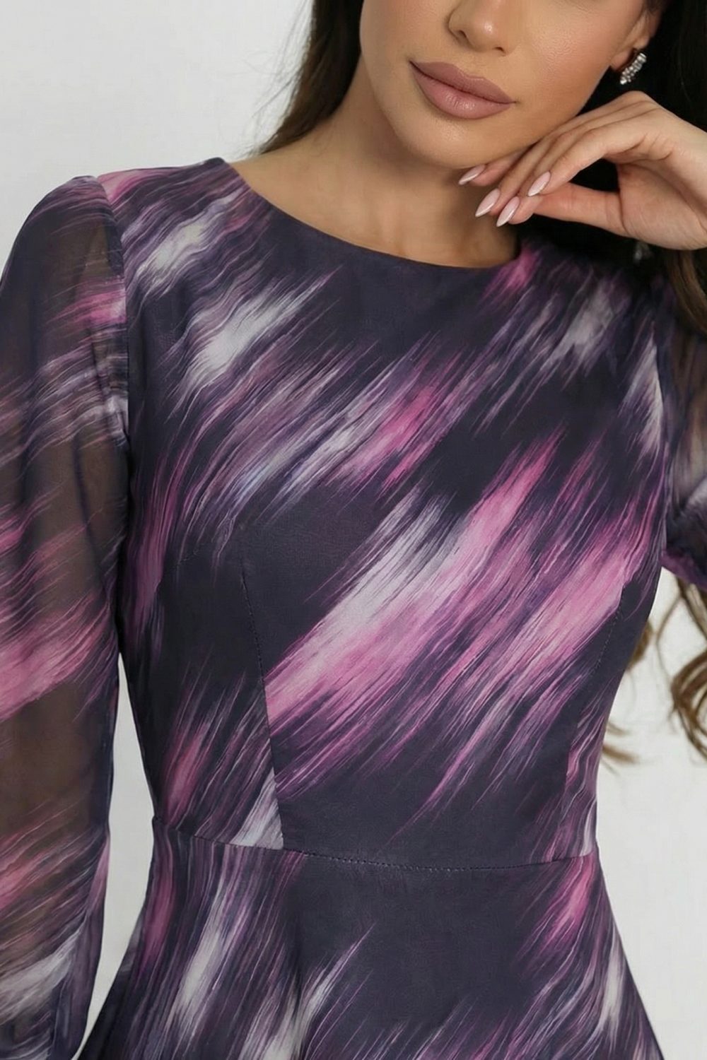 Рокля “Purple Wave Elegance” – разкроена рокля с ефектен принт и шифон ръкави арт.1517
