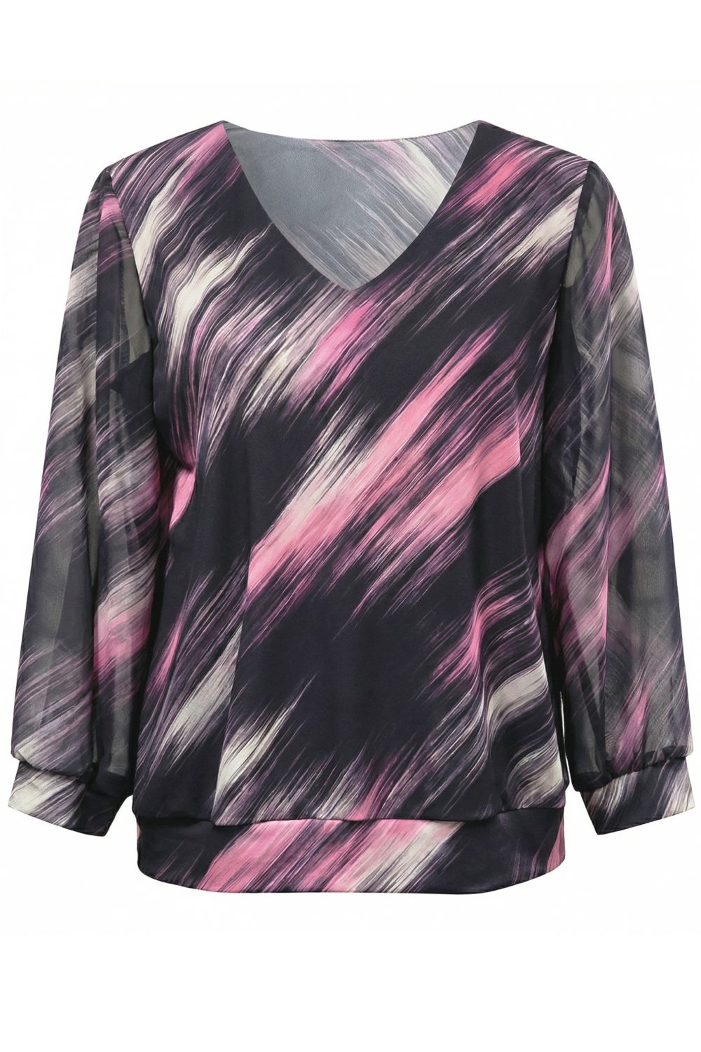Цвят: Комбинация от лилаво, розово и бяло – модерен, артистичен и изключително впечатляващ принт Стил: Ежедневен, smart‑casual и градски – идеална за разходки, работа, срещи и пътувания Кройка: Свободна и комфортна – пада красиво и стои леко по тялото Деколте: V‑образно – издължава силуета и подчертава женствеността Ръкави: Дълги – удобни, стилни и подходящи за целогодишно носене Детайли: