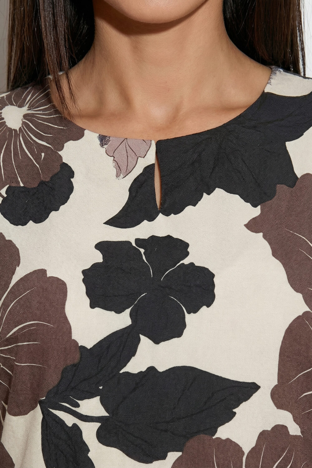 Тази елегантна права рокля в неутрален тон е универсален и стилен избор. Флоралният принт е актуален, а топлите цветове се комбинират лесно с бежови или черни аксесоари.