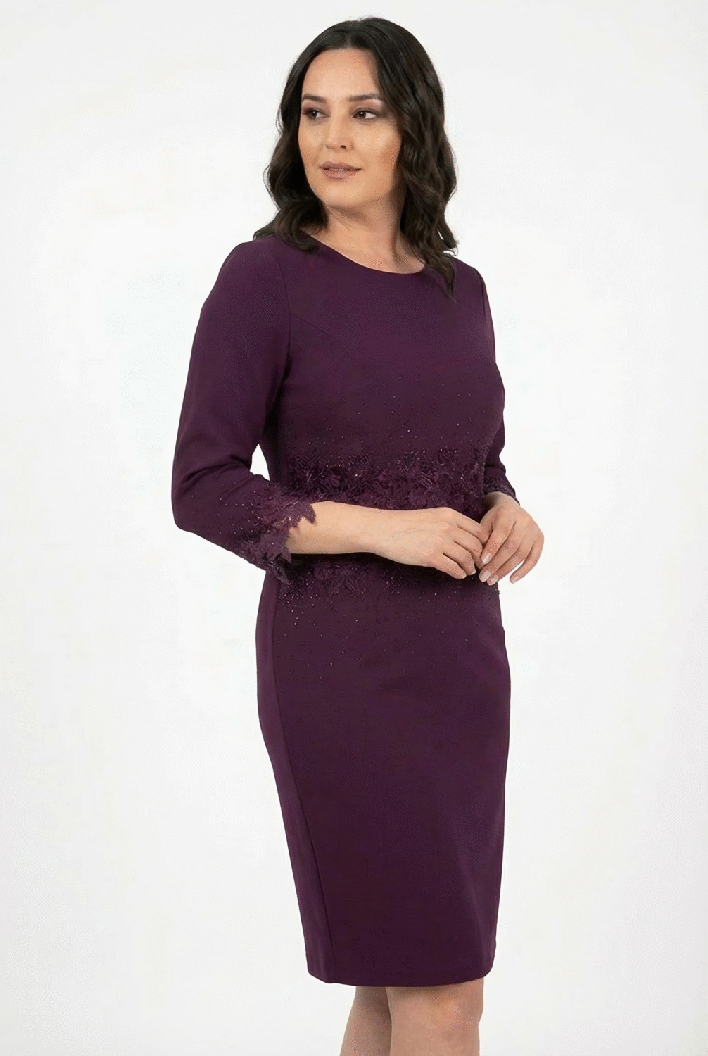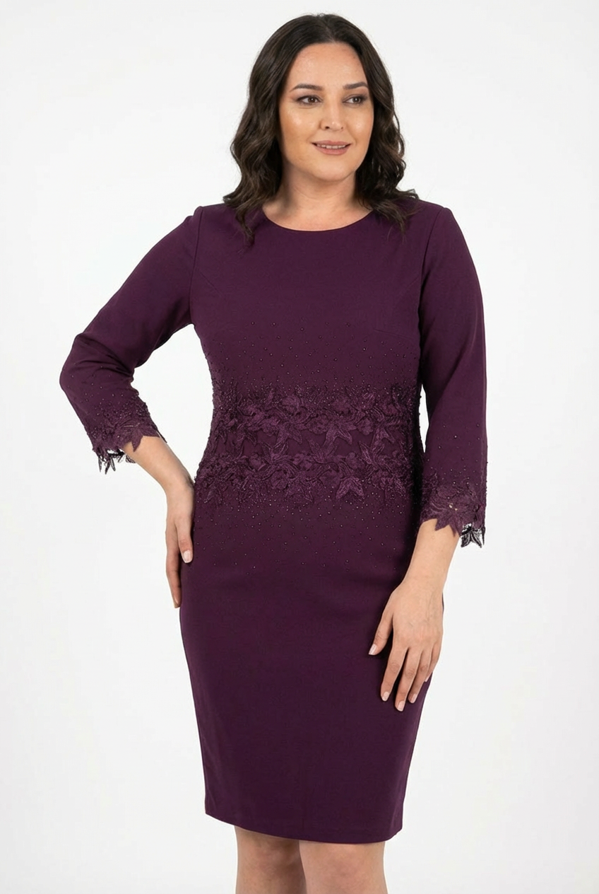 Цвят: Бургунди – наситен и благороден нюанс, който излъчва стил и женственост Стил: Класическа елегантност с романтичен привкус – подходяща за официални поводи, празнични вечери и коктейлни събития Силует: Прилепнал, с подчертана талия и изчистена линия, която подчертава фигурата Деколте: Кръгло и изчистено Ръкави: Дълги, с дантелен завършек и флорална бродерия Дължина: До коляното Детайли: Дантелена апликация в областта на талията и маншетите, с флорални мотиви и фини декорации; изискано метално лого на талията Материя: Мека и гладка, с лека еластичност и комфортно прилягане Състав: 95% полиестер, 5% еластан