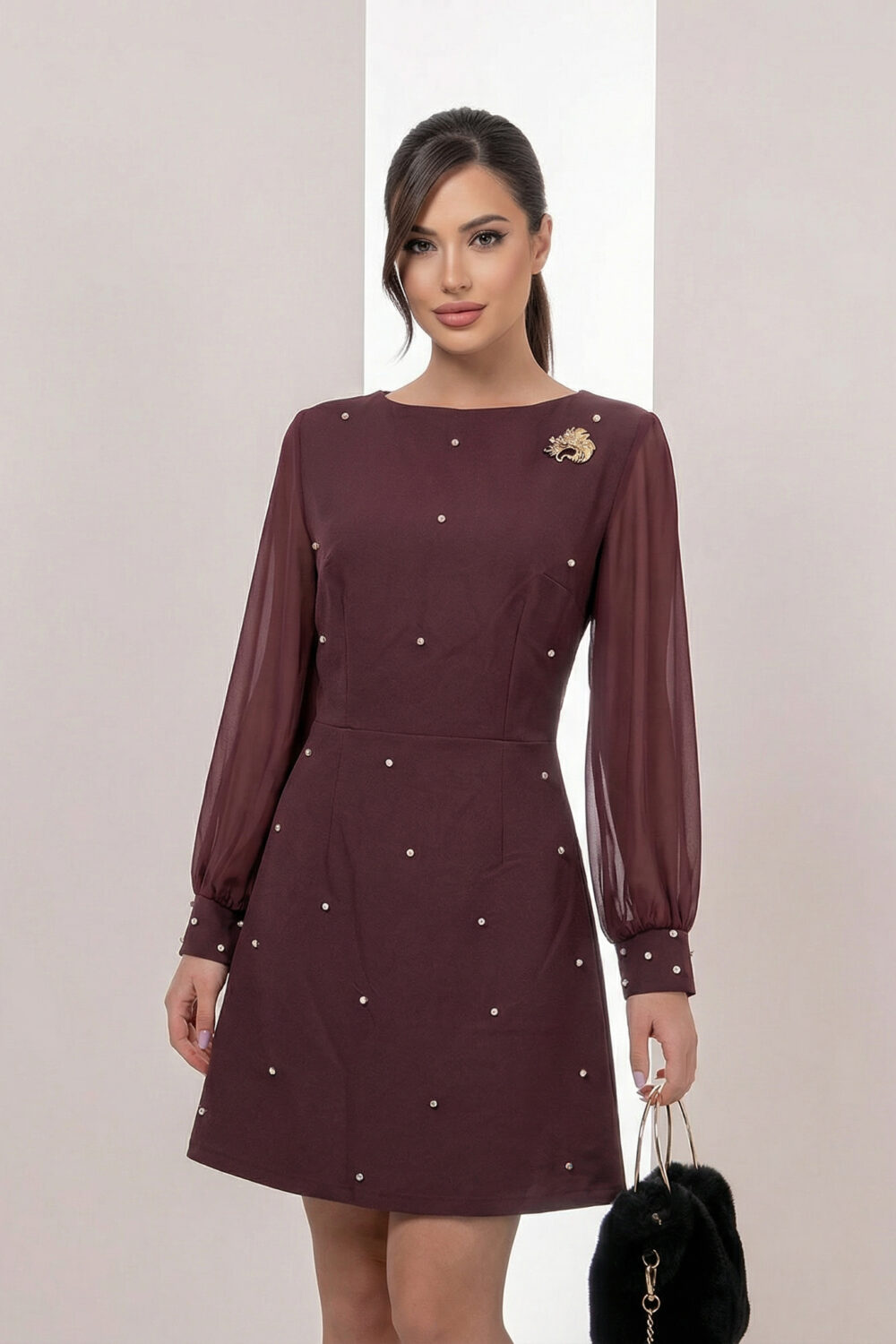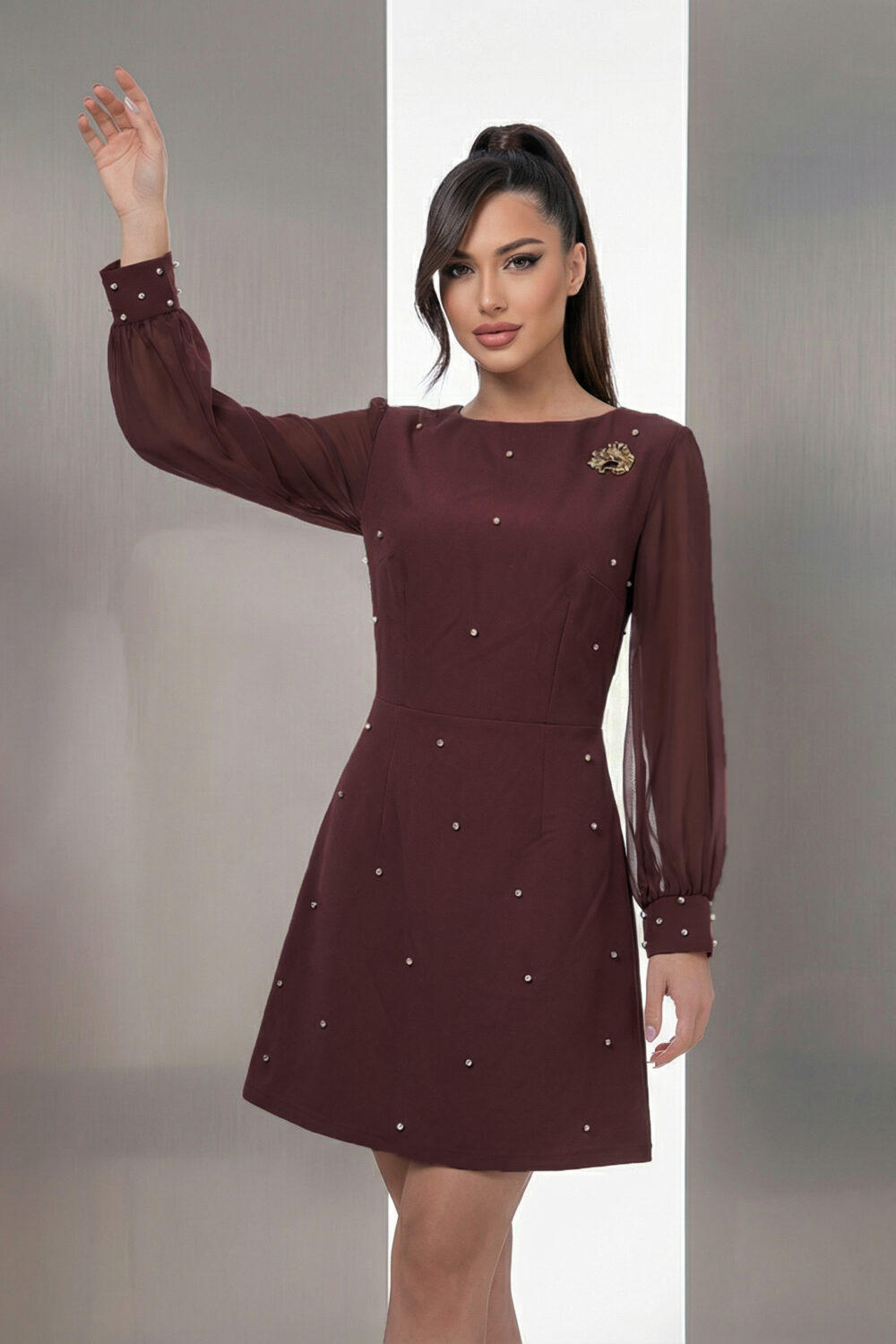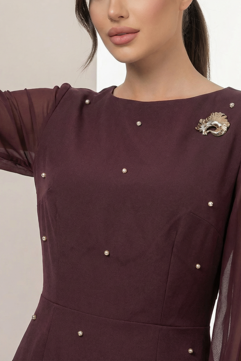 Кафява рокля с камъни и декоративна брошка – стилен модел за празнични поводи и вечерни събития. Прозрачни ръкави, елегантен силует и бляскави каменни акценти. Рокля за жени, които ценят изтънчеността и луксозните детайли.