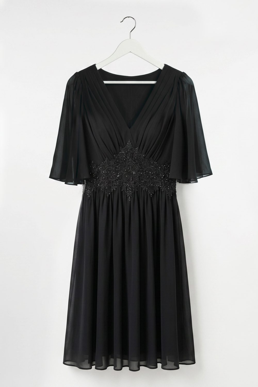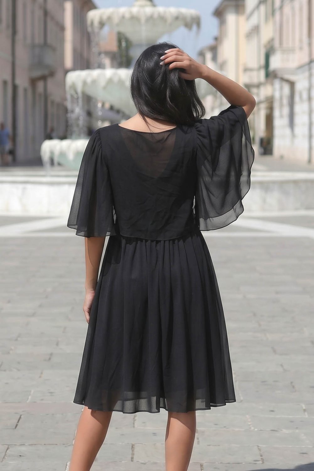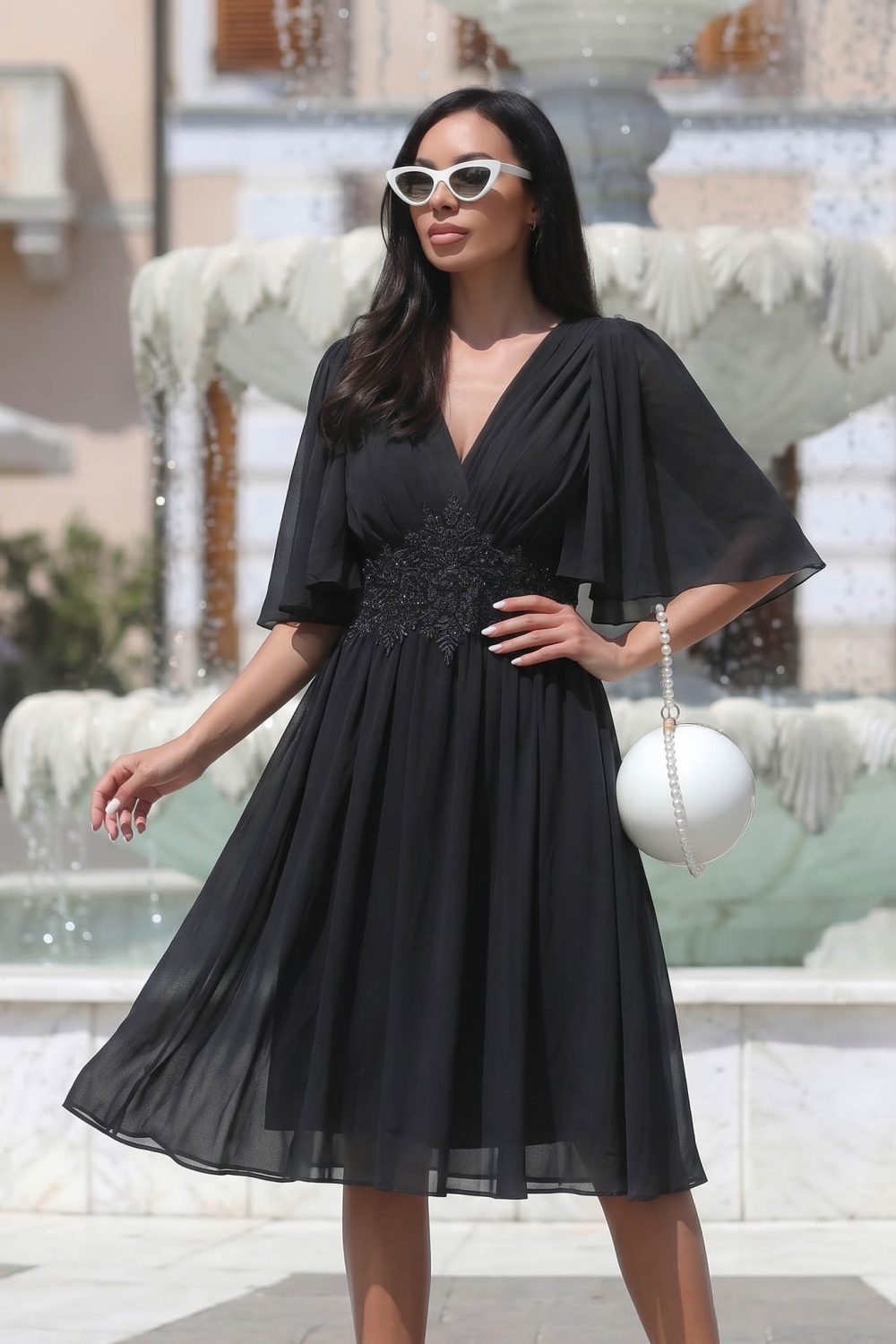 Цвят: Черен – класически, изтънчен и винаги актуален Стил: Елегантен и официален – подходящ за събития, коктейли, празненства и забележителни поводи Силует: Леко вталена горна част + свободна долна линия – оформя талията и издължава фигурата Деколте: V‑образно – женствено и издължаващо Ръкави: Плисирани, до лакътя – ефирни, прикриват ръцете и придават лекарството Талия: Дантелена зона с фини акценти – елегантен детайл, който подчертава силуета Дължина: До коляното – универсална и подходяща за различни поводи Материя: Лека, мека, нежно падаща – комфортна за целодневно носене Състав: Полиестер с еластан