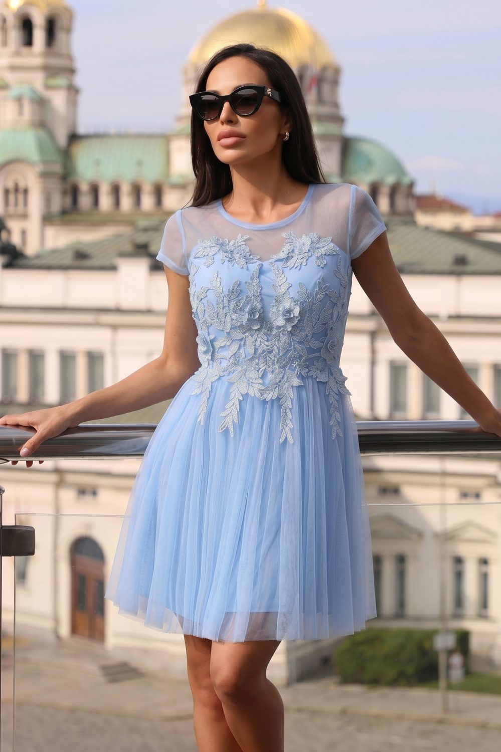 Нежна светлосиня рокля с тюлена пола и дантелена горна част – модел, който съчетава романтика, елегантност и ефирност.