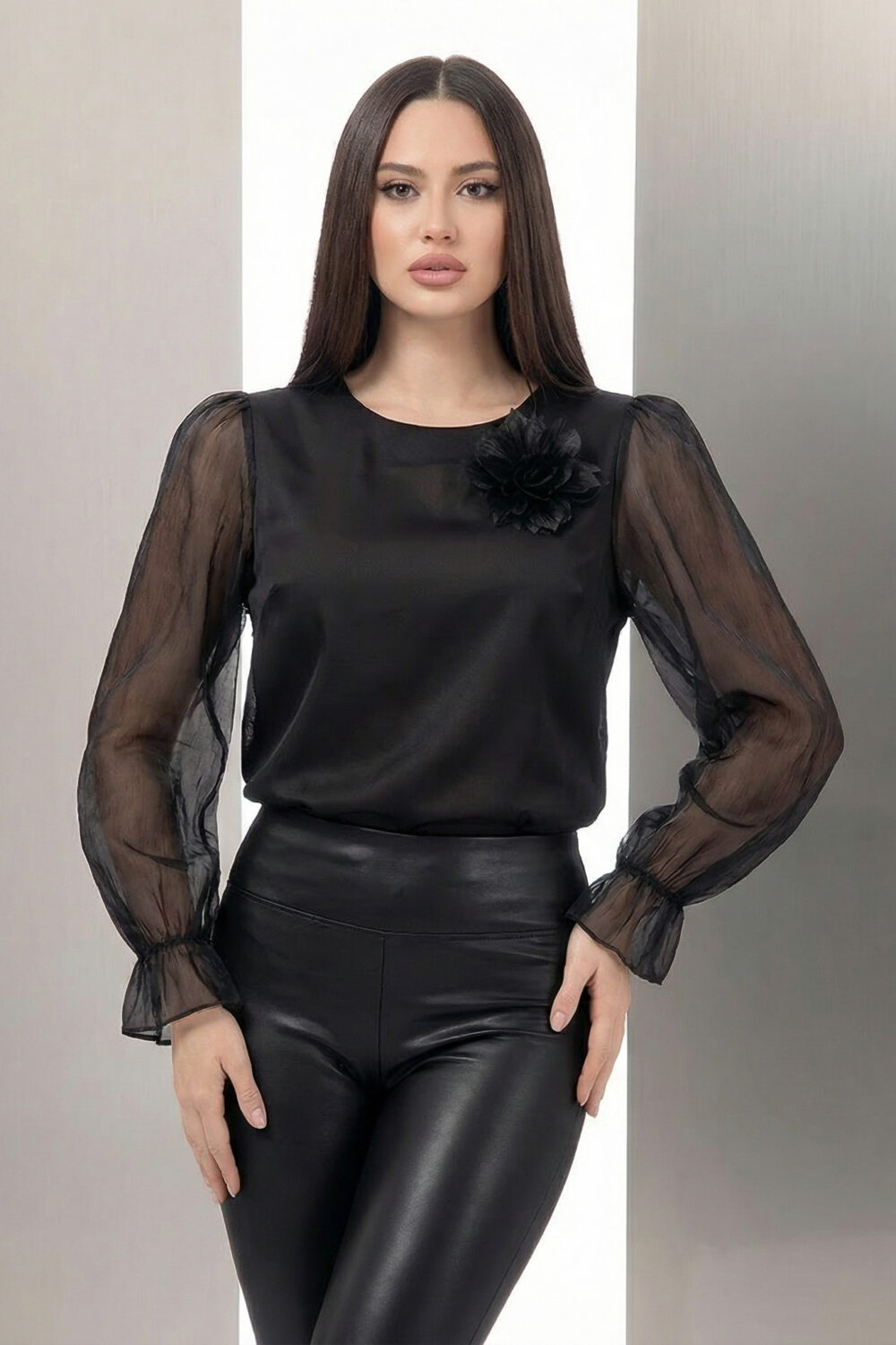 Дамска блуза с декоративно цвете и прозрачни ръкави – елегантен модел за вечерни поводи и празнични визии. Сатенена основа, обемни ръкави и изразителен акцент на рамото. Блуза за жени, които обичат да впечатляват със стил и финес.