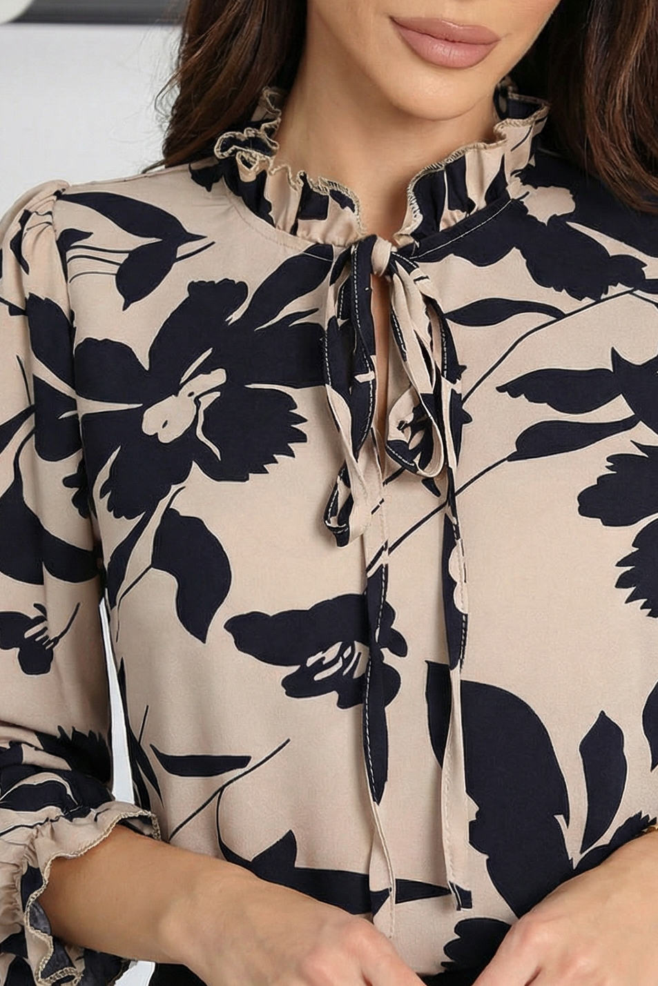 Цвят: Бежова основа с черен флорален мотив – стилен контраст с артистичен характер Стил: Елегантен и ежедневен – подходяща за офис, срещи и полуофициални поводи Силует: Свободен, леко разкроен – осигурява комфорт и женствена линия Деколте: Обло с декоративна връзка и къдрички – добавя романтичен акцент Ръкави: Дълги с ластични маншети – създават обем и завършеност Детайли: Флорален принт, къдрички около деколтето, връзка с пискюли, изчистен гръб Материя: Лека и дишаща материя с меко падане Състав: 100% полиестер