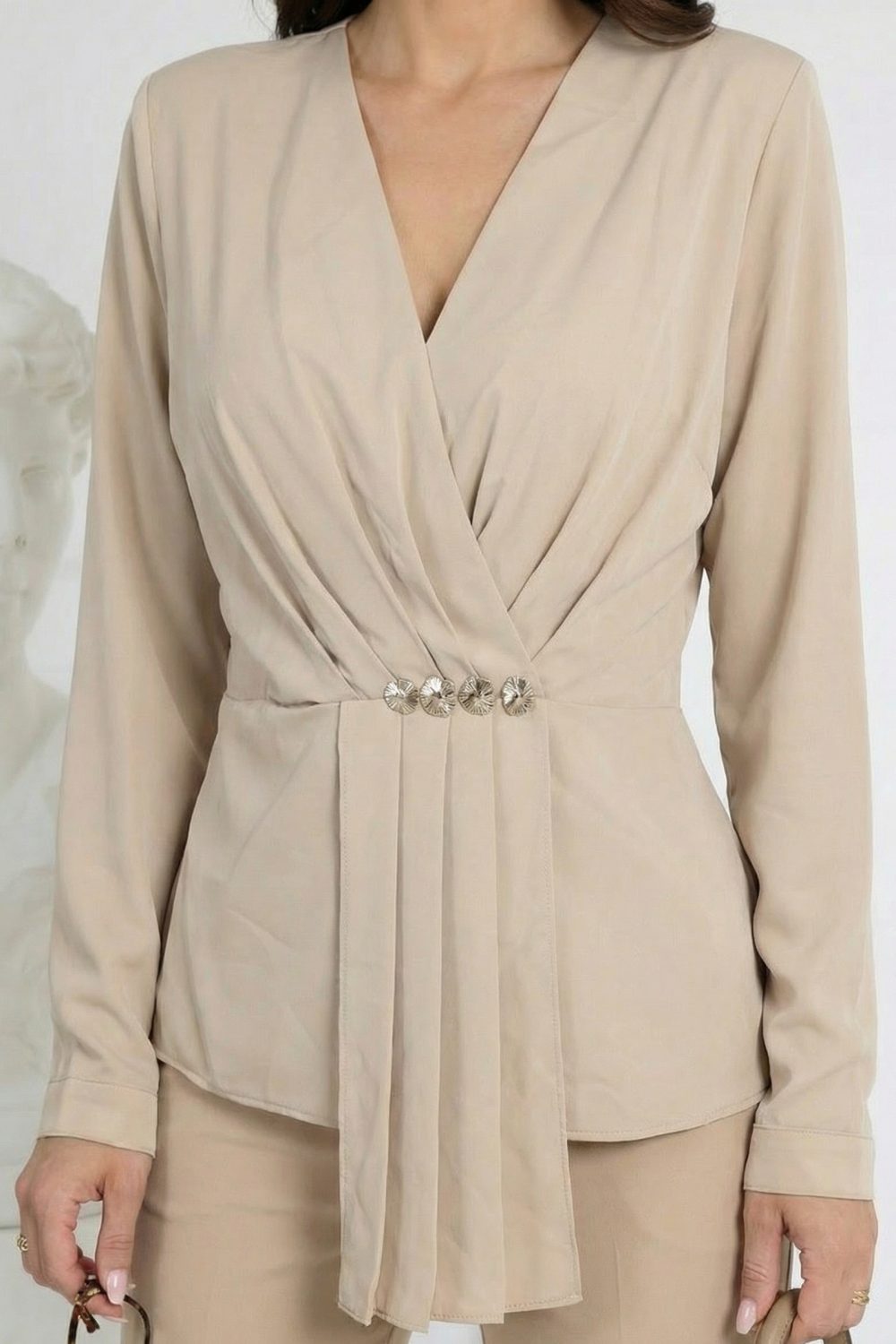 Цвят: Светло бежово – елегантно, нежно и универсално Стил: Офис, бизнес и елегантен ежедневен – подходяща за работа, срещи и специални поводи Силует: Свободна линия – пада красиво и подчертава фигурата Деколте: Обло – изчистено и стилно Ръкави: Дълги, леко свободни – добавят женственост и комфорт Детайли отпред: Плисирана предна част, златни декоративни елементи в талията Гръб:Изчистен и елегантен, с леко набиране в талията, което оформя силуета и осигурява красиво падане отзад Материя: Лека, нежна и комфортна за целодневно носене Състав: 100% полиестер