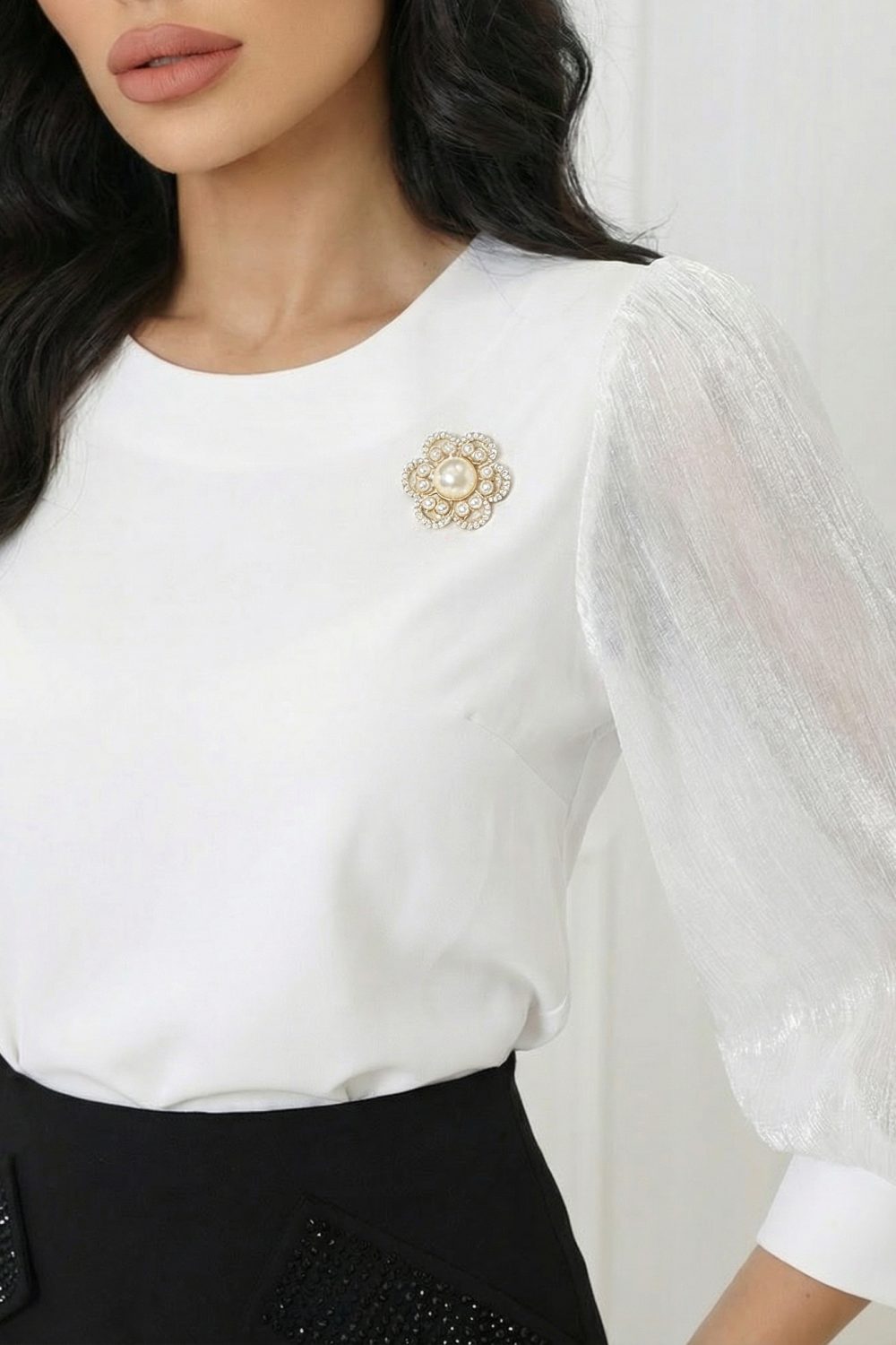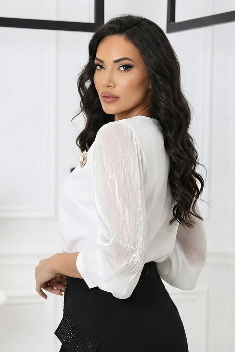 Блуза “White Luxe Charm” – елегантна бяла блуза с ефектни ръкави и брошка арт.5075