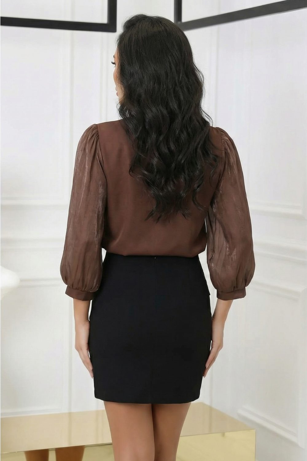 Цвят: Топло тъмно кафяво – стилно, модерно и изискано Стил: Елегантен, офис и официален – подходяща за работа, събития и специални поводи Силует: Леко вталена линия – подчертава фигурата и стои изключително женствено Деколте: Класическо обло – изчистено и универсално Ръкави:Прозрачни, обемни ръкави с фина текстура – придават луксозен и модерен акцент Детайли: Декоративна брошка в горната част, изчистен гръб, прецизна изработка Материя: Нежна, лека и комфортна за целодневно носене Състав: 100% полиестер