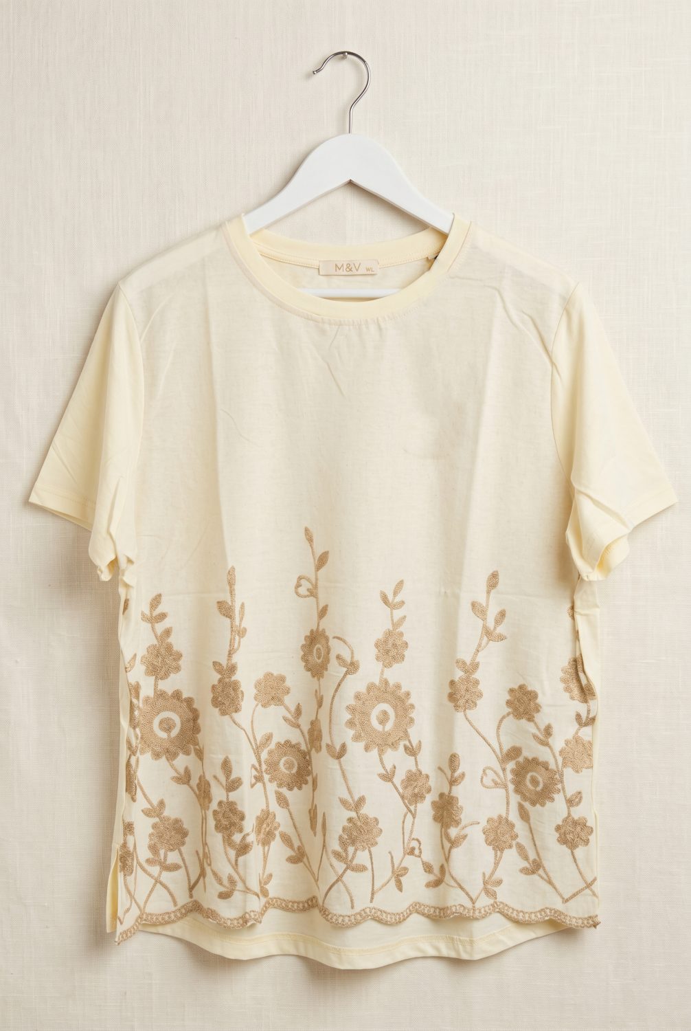 Детайли: Флорална бродерия в долната част, вълнообразен кант, деликатен релеф