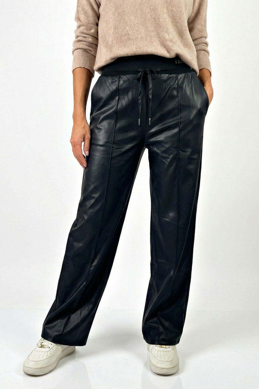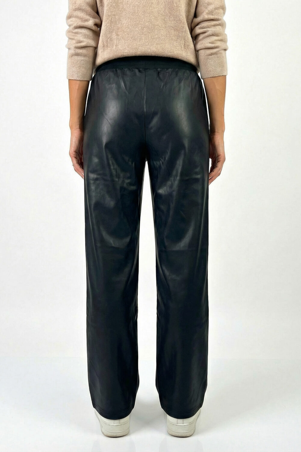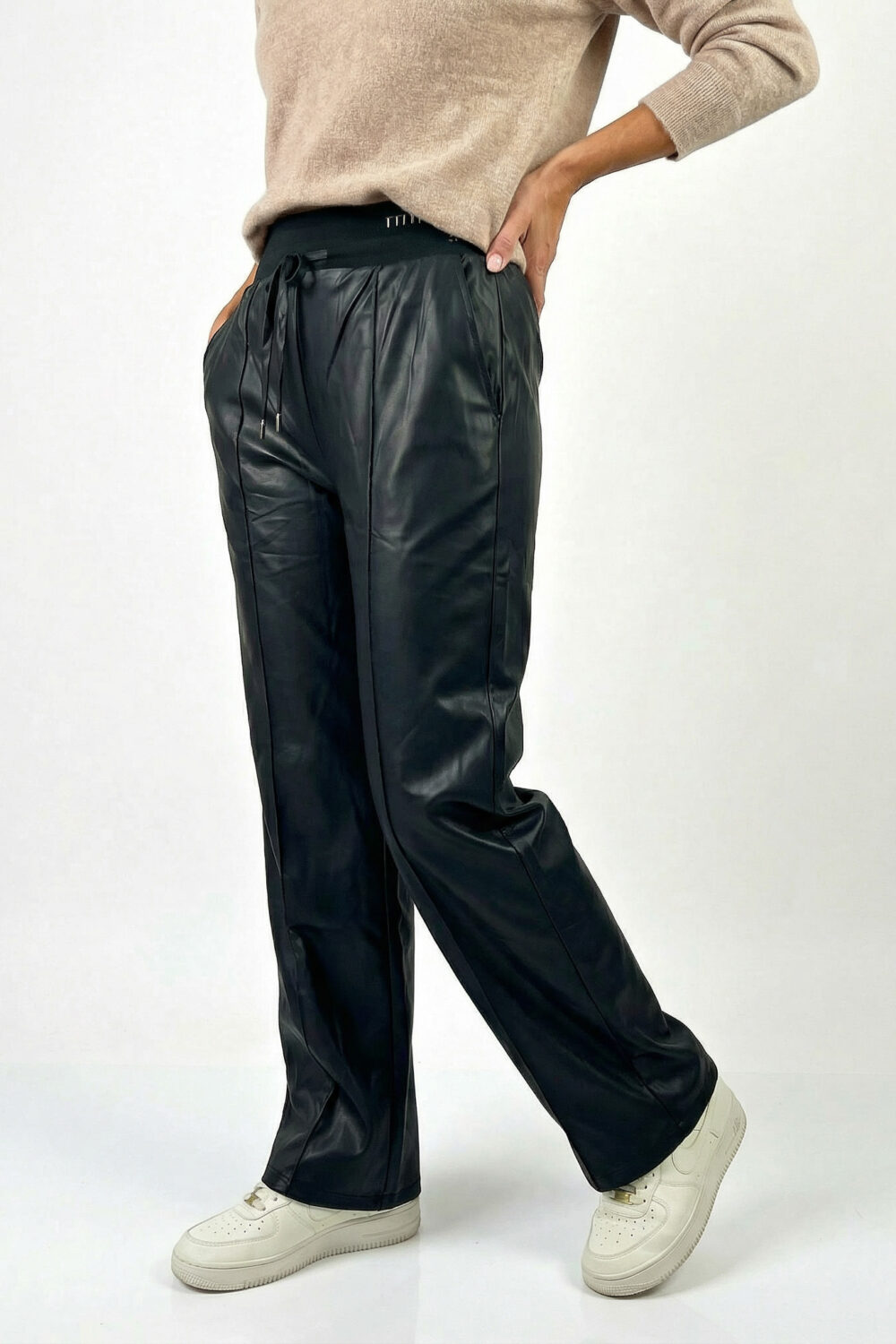 Цвят: Черен – универсален, модерен и лесен за съчетаване Стил: Градски шик – подходящ за ежедневие, уикенд визии и вечерни излизания Силует: Свободен, с права линия и леко падане по крака Талия: Средно висока с връзка – регулира се според желаното прилягане Детайли: Вертикални шевове отпред, които издължават визуално крака; матов блясък на еко кожата; ластик и връзка на талията за комфорт Материя: Мека еко кожа с лека еластичност и гладка текстура Състав: 100% полиуретан (еко кожа), подплата: 100% полиестер
