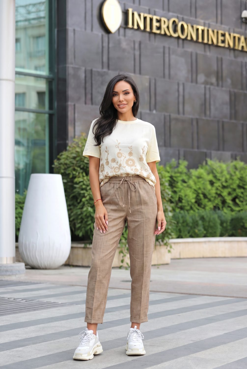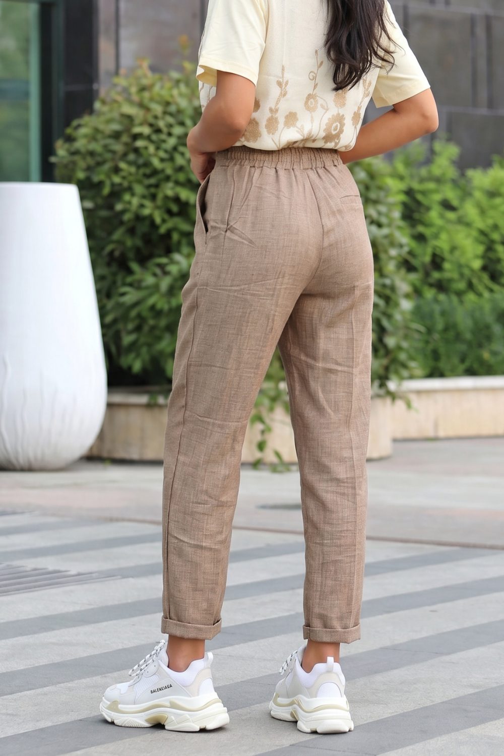 Цветът: Светъл бежов – естествен, модерен и универсален Стил: Ежедневен и casual – идеален за пролет/лято, разходки, пътуване и ежедневие Силует: Свободна, падаща линия – стои леко, не очертава и подчертава силуета естествено Талия: Ластик + връзки за регулиране – максимален комфорт Детайли: Джобове, леко стеснен крачол, естествена текстура Материя: Лен – лека, дишаща, прохладна